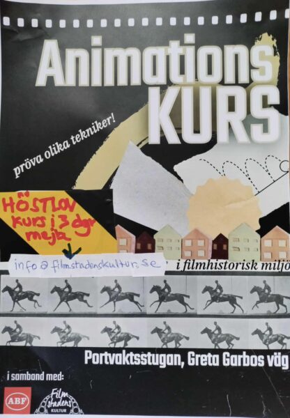 I mysig filmhistorisk miljö får du fördjupa dig i animationsfilmens historia och prova på olika tekniker med teckningar, cut out och lera. Välkommen på en lekfull kurs! Allt material och all teknik kommer att finnas på plats.